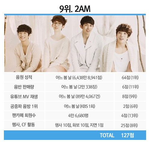 2AM은 음원 부문에서 넘사벽급 인기를 누렸다. 지난 3월 '어느 봄날'로 음원 성적 1위를 기록하며 대중적 인기를 과시한 것. 비스트, 인피니트 등 쟁쟁한 아이돌을 2,000만점 이상의 차로 따돌렸다. 달달한 발라드로 남녀노소에게 많은 사랑을 받았다.