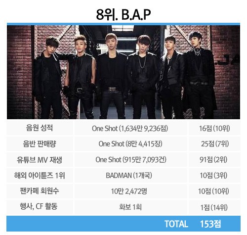 '디스패치'가 상반기 남자 아이돌의 성적을 수치로 합산, 순위를 매겼다. 국내 인기를 알 수 있는 음반, 음원을 비롯해 지상파 음악방송 횟수, 팬카페 회원수 등을 포함했다. 유투브, 아이튠즈 등을 통해 해외 인지도 및 성적도 함께 점검했다.