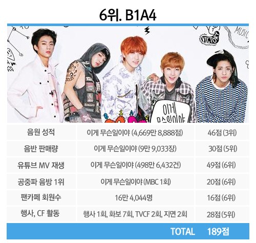◆ 6위> B1A4 : "음원 돌풍, 인지도 높여"