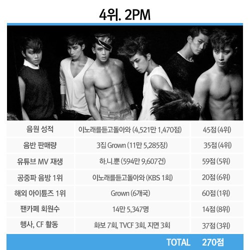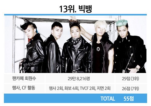 올해 빅뱅의 신곡 활동은 없었다. 지난 9월부터 승리, 지드래곤이 개인 활동을 시작했지만, 완전체 활동이 아니므로 순위에 포함되지 않았다. 팬카페 회원수는 29만 8,216명으로 3위. 데뷔 7년차를 바라보는 아이돌이지만, 팬층은 건재했다.