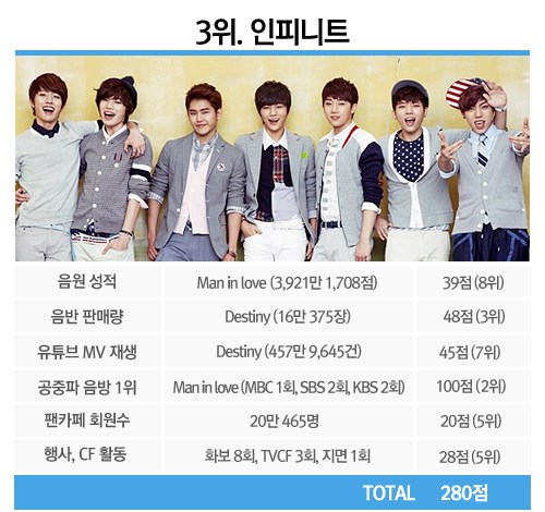 인피니트는 국내 활동 성적이 좋았다. 지상파 음악 방송 부문에서 2위에 올랐다. '음악중심' 1회, '인기가요' 2회, '뮤직뱅크' 2회 1위를 달성했다. 지난 3월 발표한 '맨 인 러브'가 음반, 음원 부분 고른 성적을 받은 덕분이다. 달달한 멜로디로 대중성까지 확보했다.