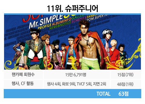 슈퍼주니어는 인지도 '킹'다운 면모를 과시했다. 무대 외 활동점수에서 1위를 차지했다. 비스트, 인피니트 등 쟁쟁한 후배 아이돌을 제친 것. 특히 TV 광고는 5회 촬영으로, 최다횟수다. 화장품, 통신사, 의류, 치킨 등의 광고를 촬영하며 대중에게 어필했다.