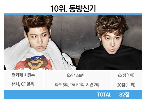 2013년, 동방신기는 음반 활동이 없었다. 하지만 탄탄한 팬덤이 순위권 유지에 큰 역할을 했다. 팬카페 회원수는 총 62만 288명이다 해당 부문 1위다. 2위와 2배 이상 격차로 압도적인 정상에 올랐다. 덕분에 전체랭킹 10위에 안착했다.