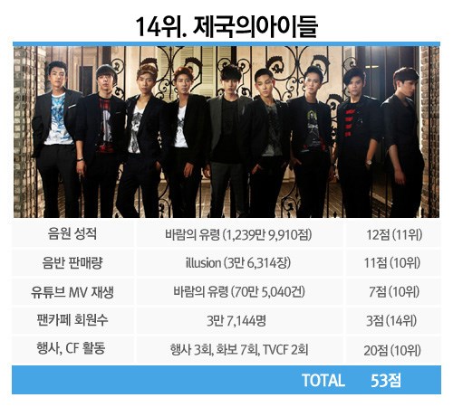 단, 활동 점수는 10위로 높은 편이다. 틴탑, 엠블랙을 제쳤다. 특정 멤버의 활약이 컸다. 예능돌로 급부상한 3인(황광희, 임시완, 박형식) 위주로 화보, TV광고 촬영을 진행한 것이 컸다. 이 3인방의 인기가 제국의 아이들 전체 인기로 이어질 지 기대해 볼만하다.