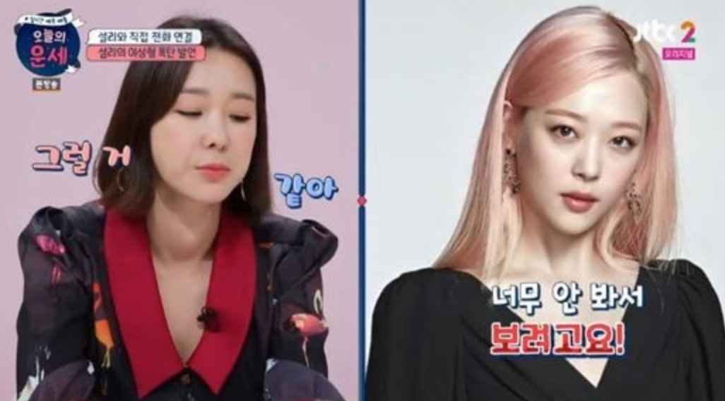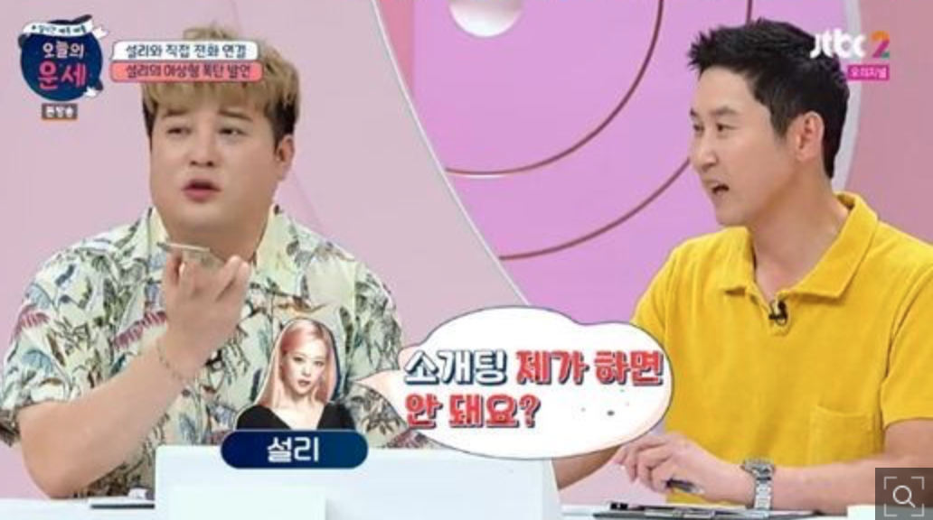 또한 설리는 “나이차이도 신경 써서 남자친구를 만나야겠다. 나이차이를 줄여보려 한다”라며 “내가 ‘오늘의 운세’ 소개팅에 나가야겠다”고 고 덧붙였다.