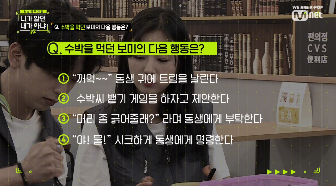 여기서 퀴즈 나갑니다. 4번째 문제, 수박을 먹은 보미의 다음 행동은 ?