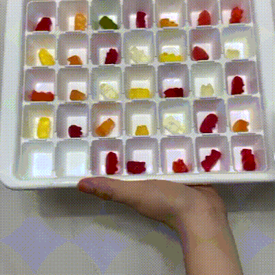 젤리가 보이시나요? 하리보 젤리가 얼음트레이 하나 하나에 누워있는 모습인데요.