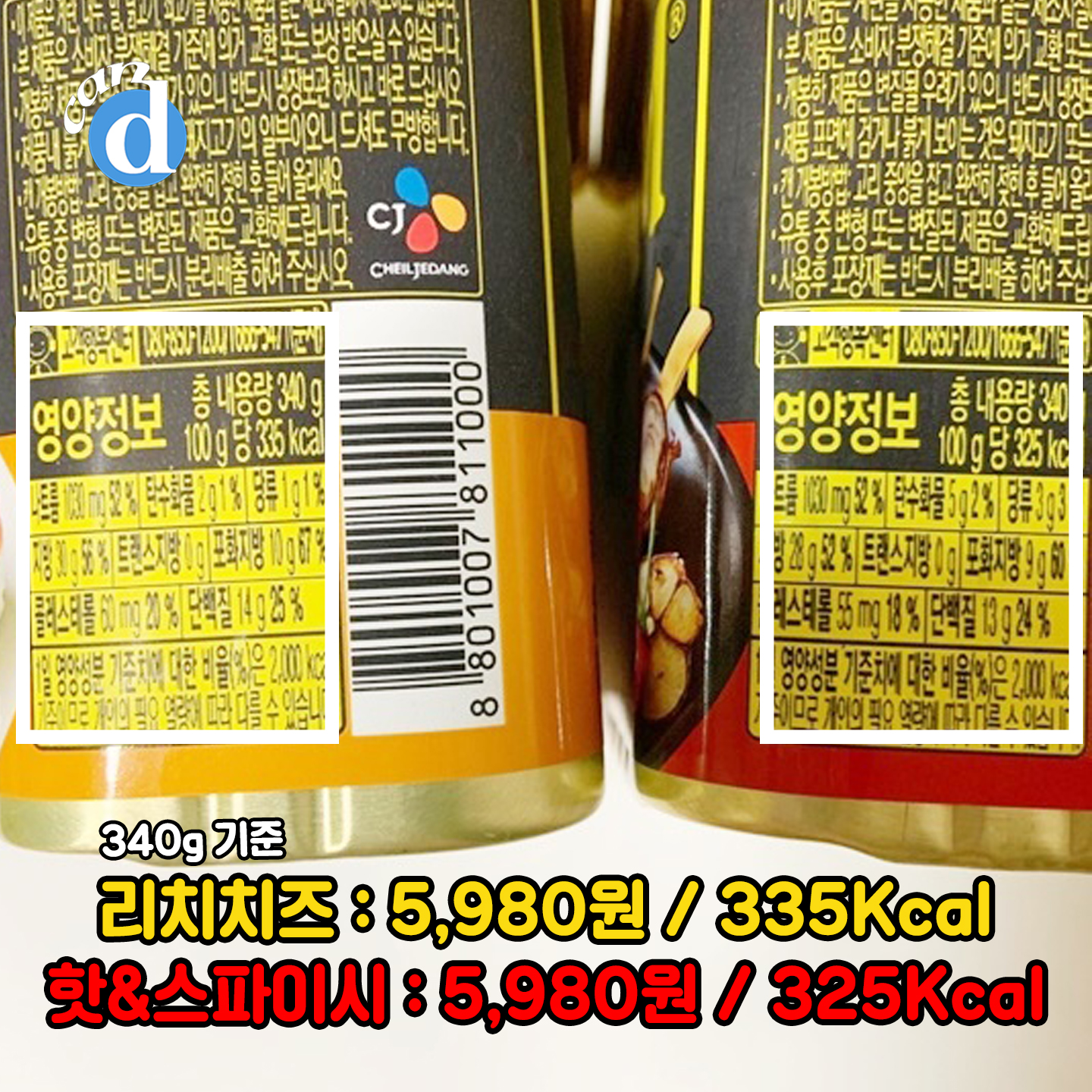 리치치즈에는 진한 치즈 맛을 내는 하이멜트 치즈가 들어있고, 핫&스파이시에는 불 맛이 나는 소스가 약 4% 정도 첨가 되었습니다.