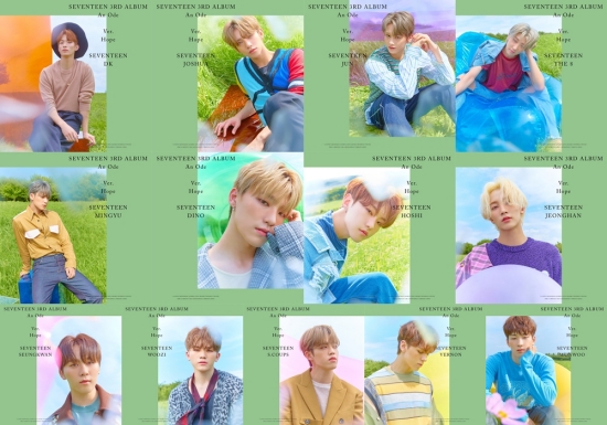 [Dispatch=김수지기자] 세븐틴이 역대급 청량미를 과시했다. 4일 공식 홈페이지에 정규 3집 '언 오드'(An Ode) 호프(Hope) 버전 포토를 공개했다.