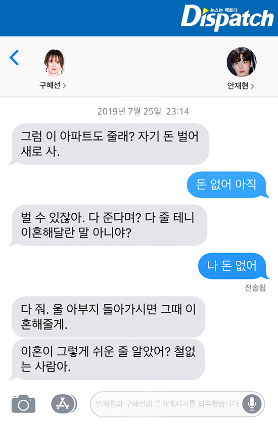 (구혜선이 개인 인스타그램에 먼저 문자를 공개했다. '디스패치'는 골이 깊어진 배경을 찾았다. 둘 사이의 지극히 사적인 대화는 제외했다.)