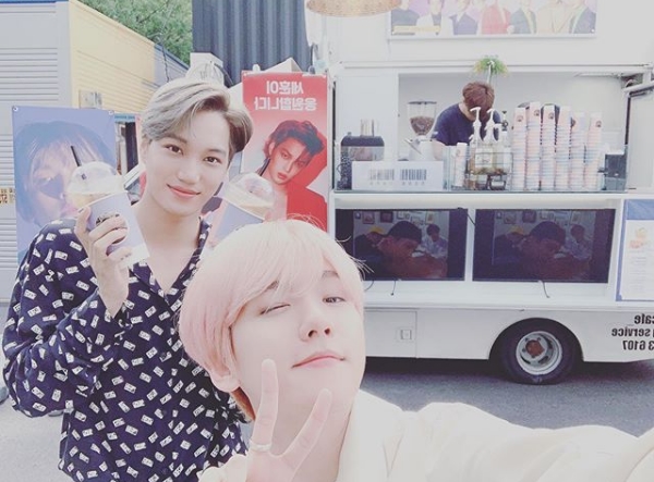 사진 속 백현은 카이와 함께 커피차 앞에서 포즈를 취한 모습이다. 이 커피차는 세훈이 보낸 것으로 백현과 카이를 향한 응원의 메시지가 담겼다.