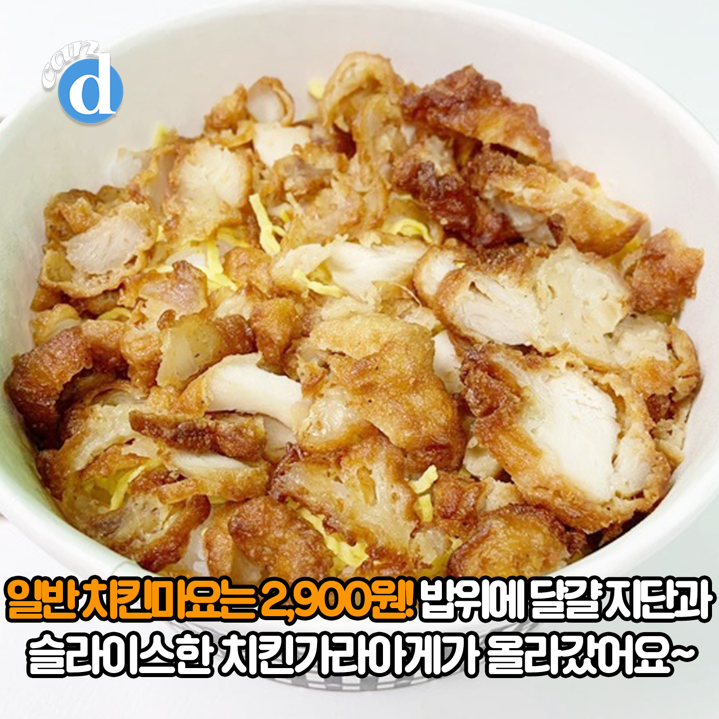 일반 치킨마요는 2,900원. 구성은 똑같습니다. 밥 위에 달걀지단과 슬라이스 한 치킨가라아게가 올라가 있는데요.
