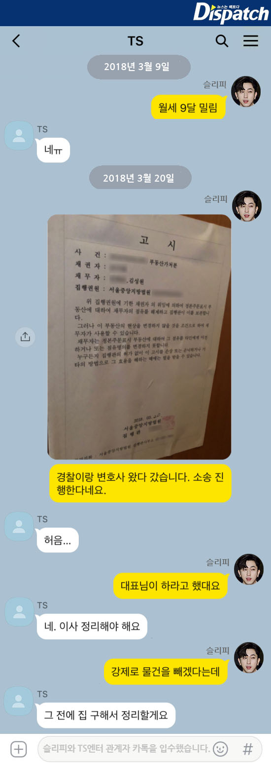 '디스패치'는 슬리피와 TS가 맺은 전속 계약서를 확인했다. 10년 동안 주고받은 입출금 내역도 살펴봤다. 양측이 나눈 카카오톡 메시지도 체크했다.