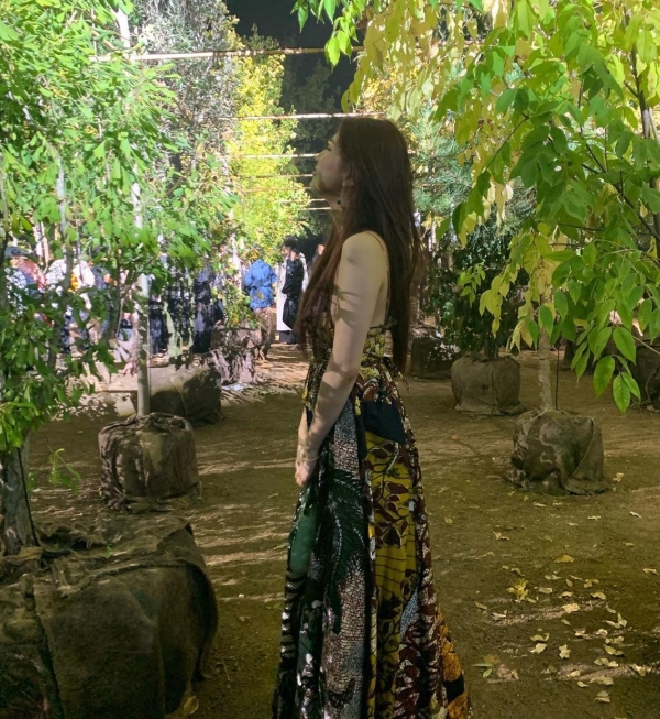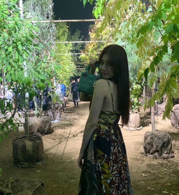 또 다른 사진에는 숲 콘셉트로 만들어진 런웨이에서 수줍게 웃고 있는 수지의 모습이 포착됐는데요.