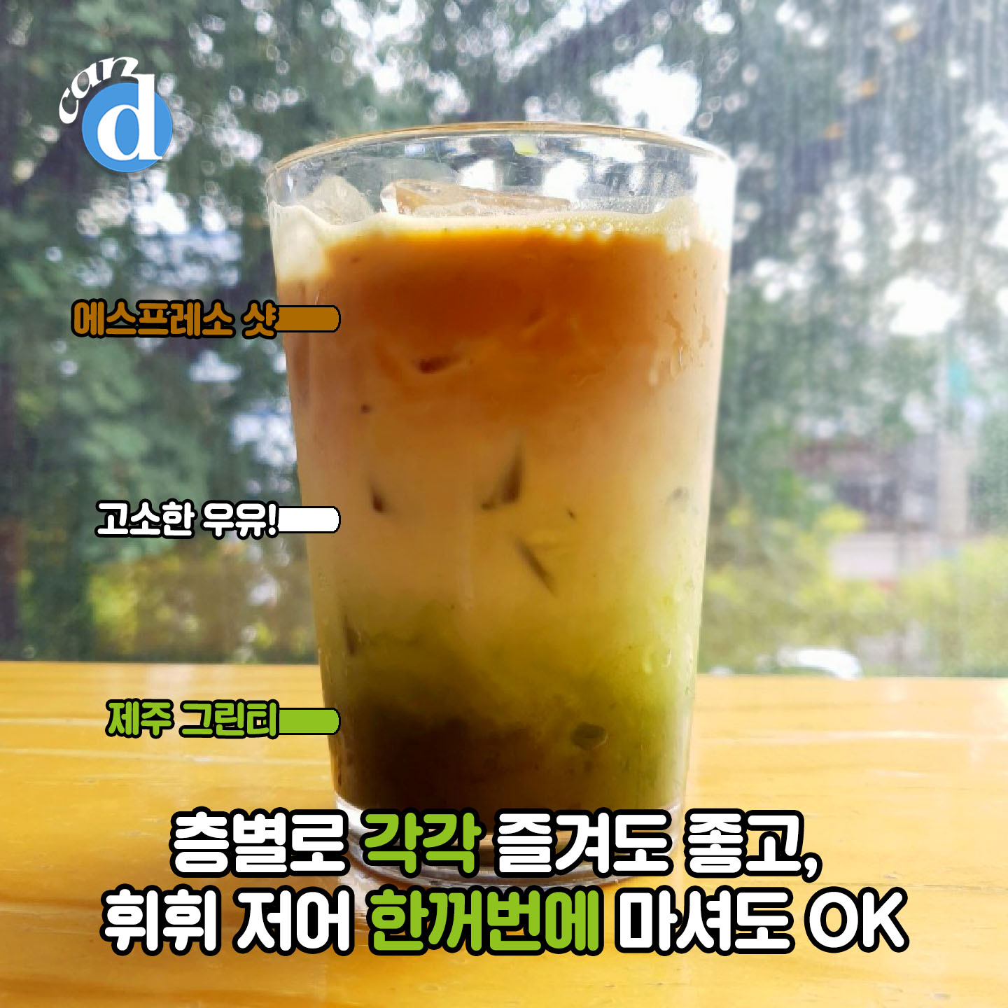 샷그린티라떼의 포인트죠. 3단 구성. 달콤 쌉싸름한 제주산 그린 티와 고소한 우유, 깊고 진한 풍미의 에스프레소 샷이 아름답게 레이어드됐는데요.
