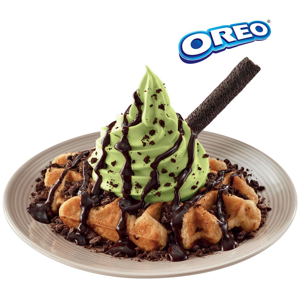 콘과 컵 모두 출시했습니다. 콘을 선택하면 검은색 와플 콘에 오레오 쿠키 웨이퍼 과자가 꽂혀있는데요. 말차와 오레오는 최고의 조합을 만들었죠. “말차 아이스크림이 오레오의 달콤함과 잘 어울린다”라고 소개했습니다.