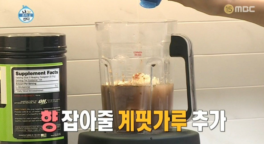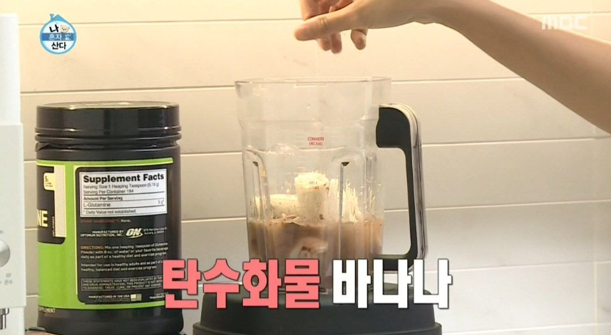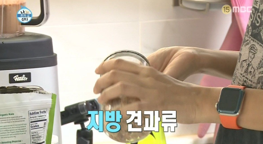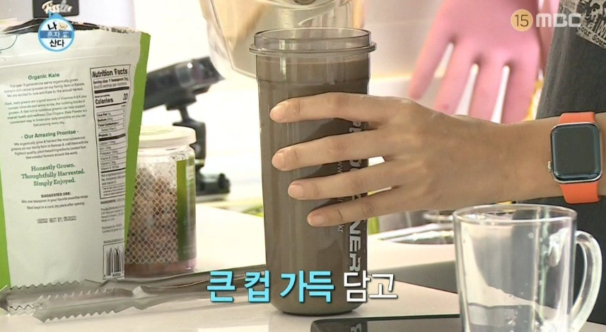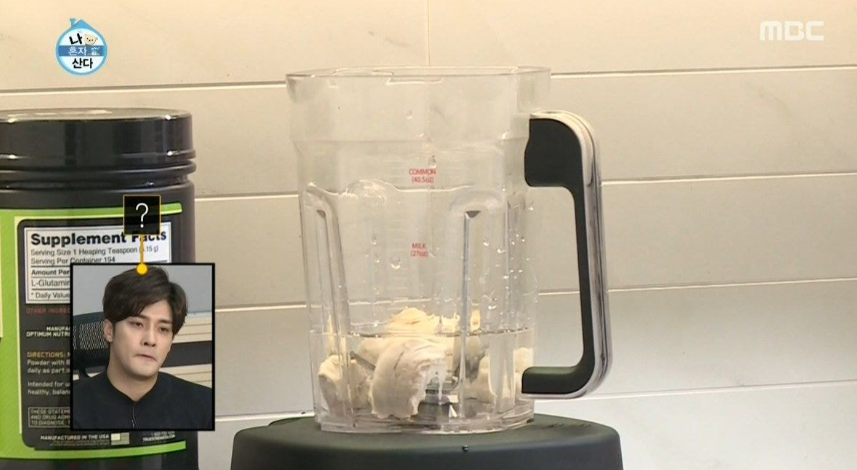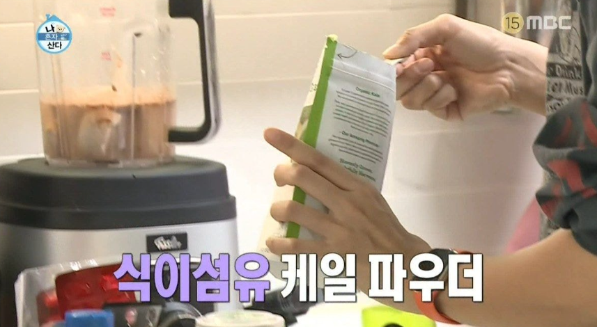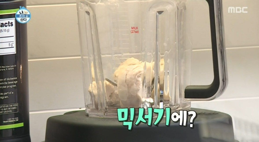 레시피는 간단했습니다. 한혜진은 삶은 닭가슴살, 바나나, 견과류, 케일 파우더, 계피가루 등을 물과 함께 믹서기에 넣고 갈았습니다.