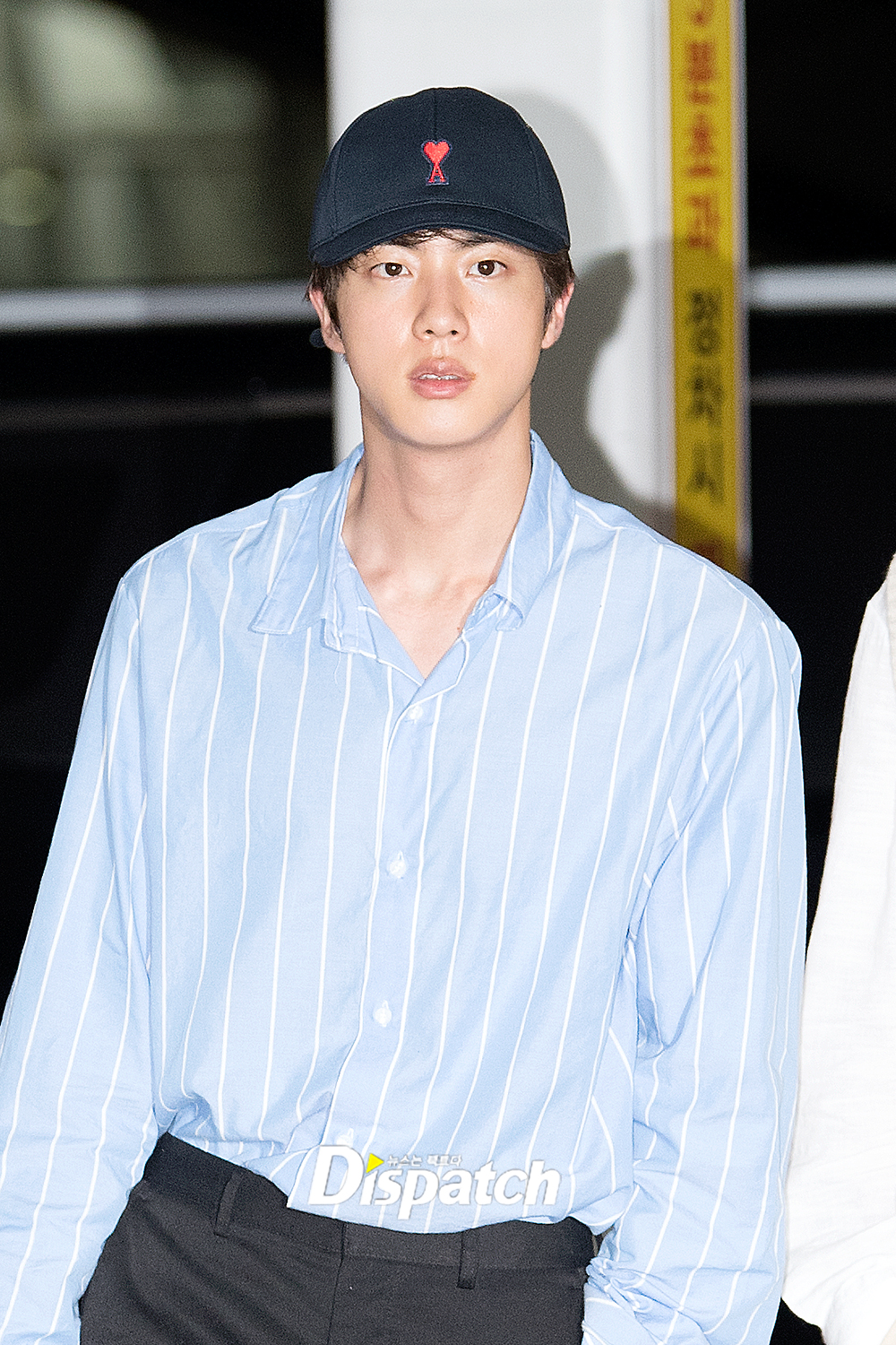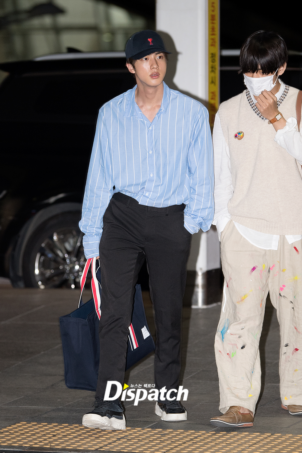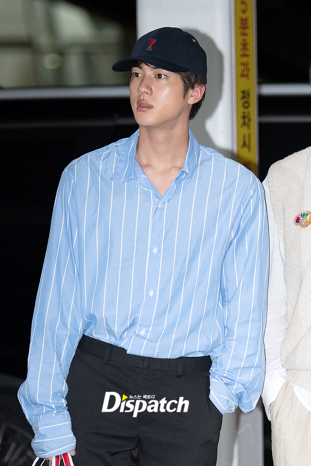 '방탄소년단' 진은 이날 블랙슬렉스에 셔츠를 매치해 댄디한 공항패션을 연출했다. 조각같은 외모도 돋보였다.
