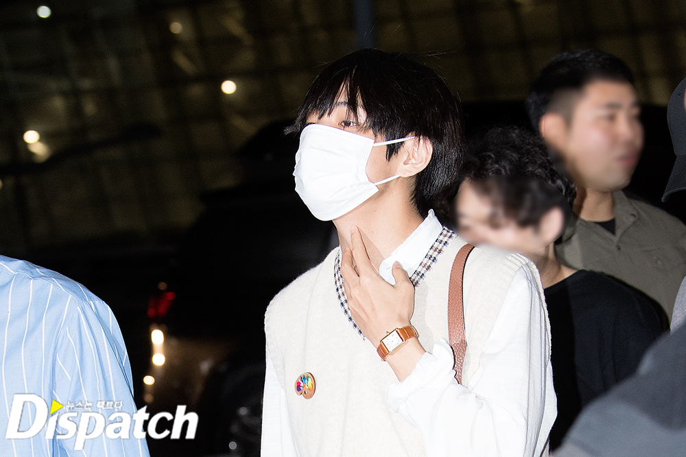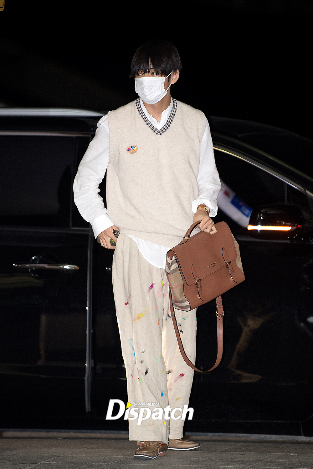 '방탄소년단' 뷔는 이날 아이보리 팬츠와 셔츠로 댄디한 공항패션을 연출했다. 마스크로 얼굴을 가렸지만 조각같은 비주얼이 돋보였다.