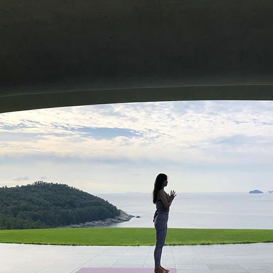 공개된 사진 속 이하늬는 레깅스차림이었는데요. 다양한 포즈를 취했습니다. 팔을 쭉 뻗기도 했고요. 절벽과 바다를 배경으로 쭉 뻗은 자세를 유지하기도 했죠.
