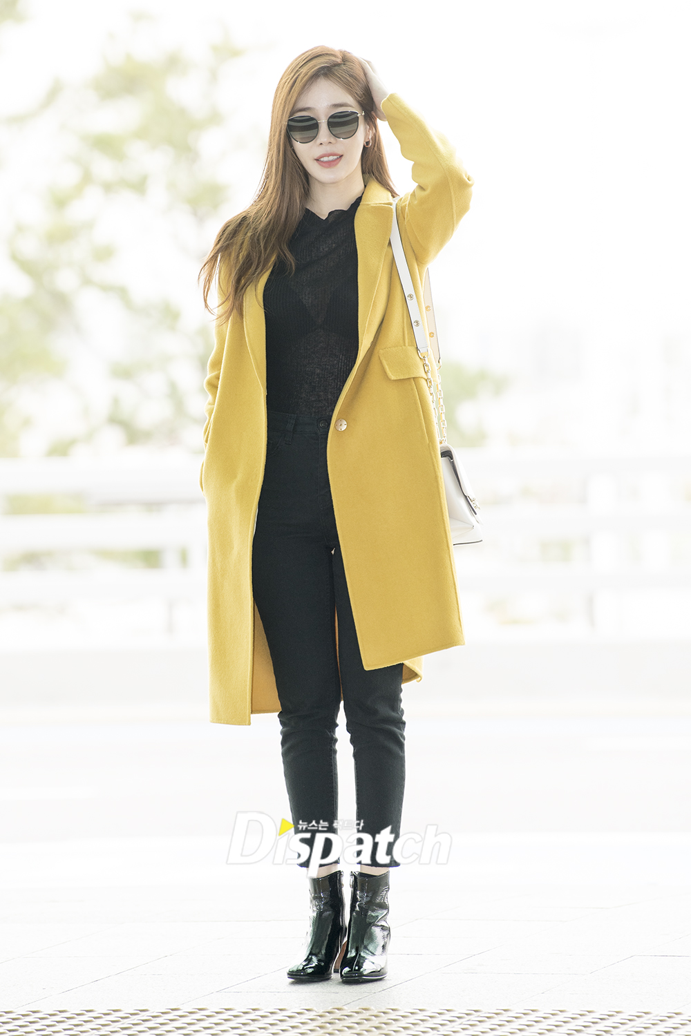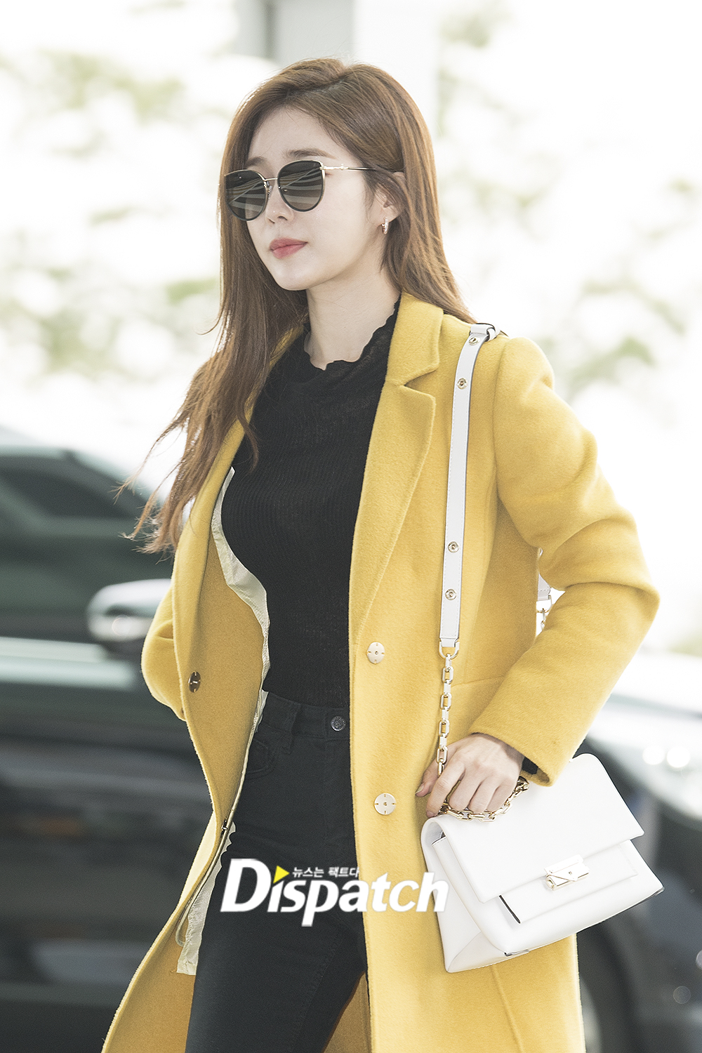 유인나는 이날 블랙진에 옐로우 코트로 청순하면서도 섹시한 공항 패션을 어필했다.