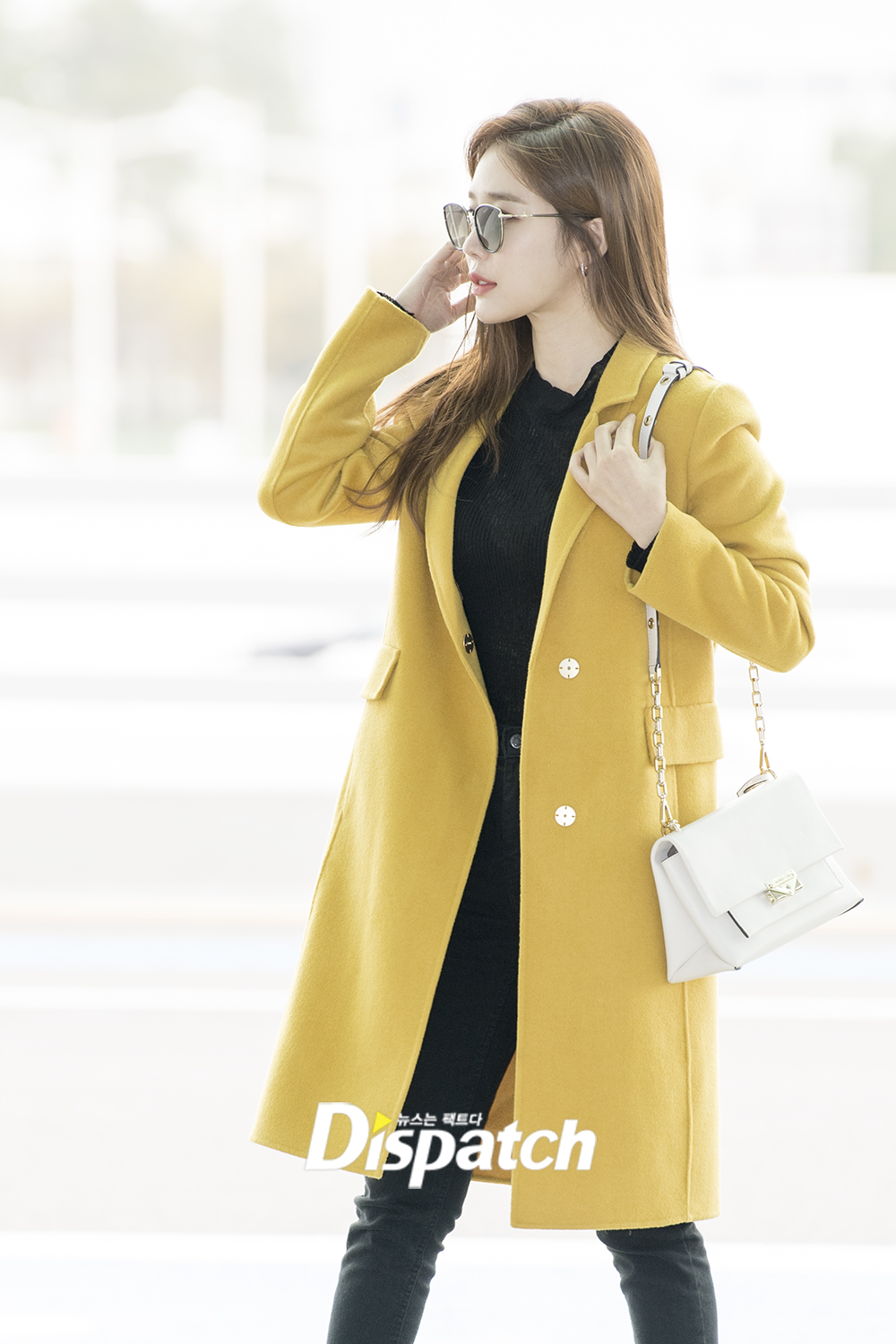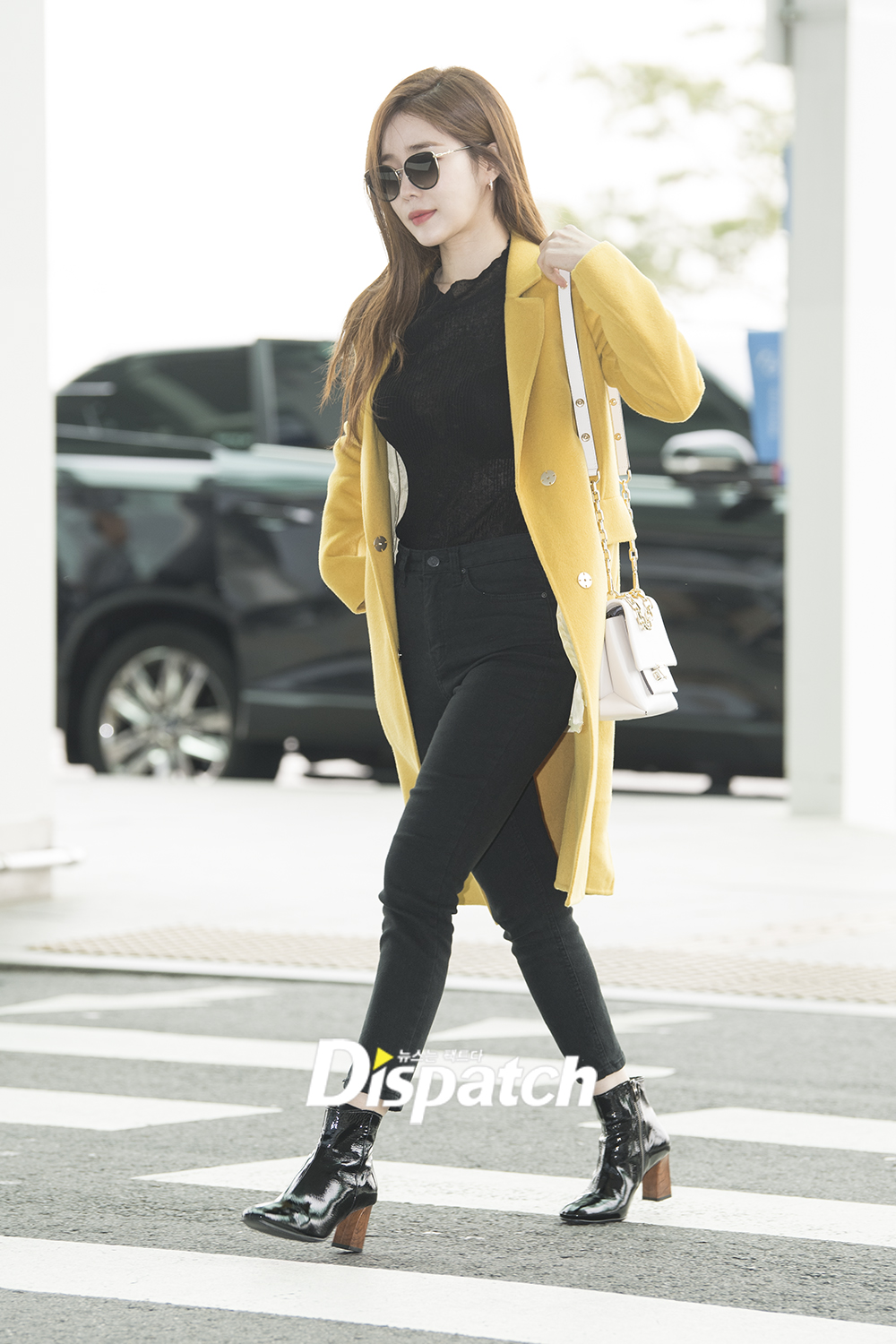 유인나는 이날 블랙진에 옐로우 코트로 청순하면서도 섹시한 공항 패션을 어필했다.