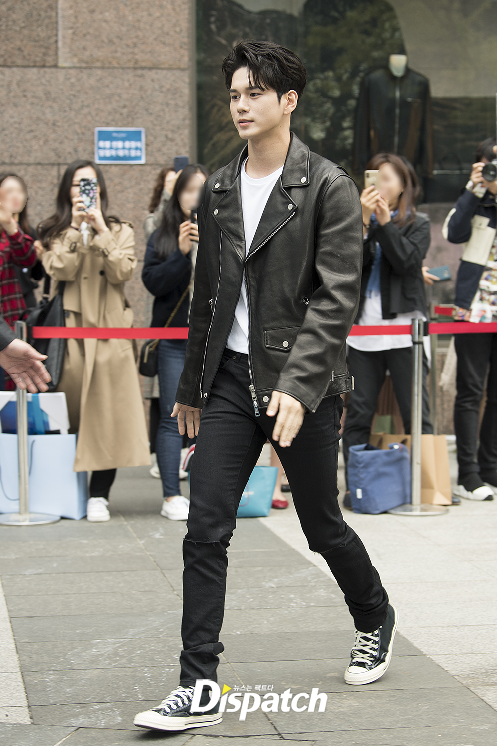 옹성우는 블랙레더 자켓을 입어 맵시를 뽐냈다. 행사장 주변은 옹성우를 보기 위해 몰린 팬들로 인산인해를 이뤘다.