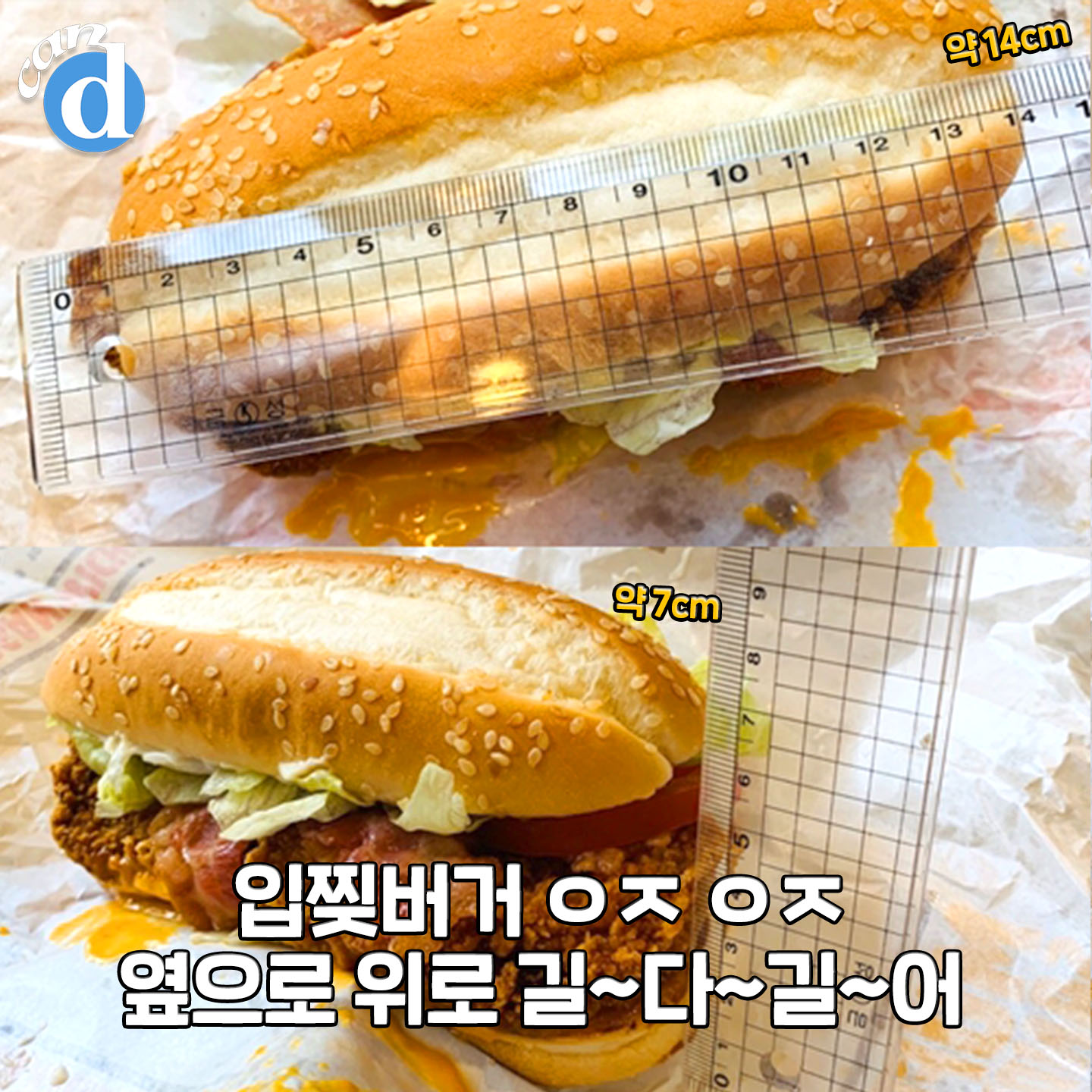 옆으로 긴 치킨버거. 무려 14cm 길이를 자랑했습니다. 키는 7cm.