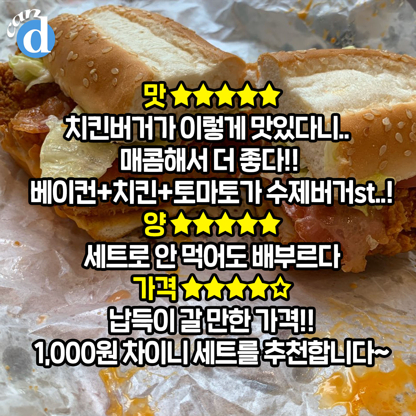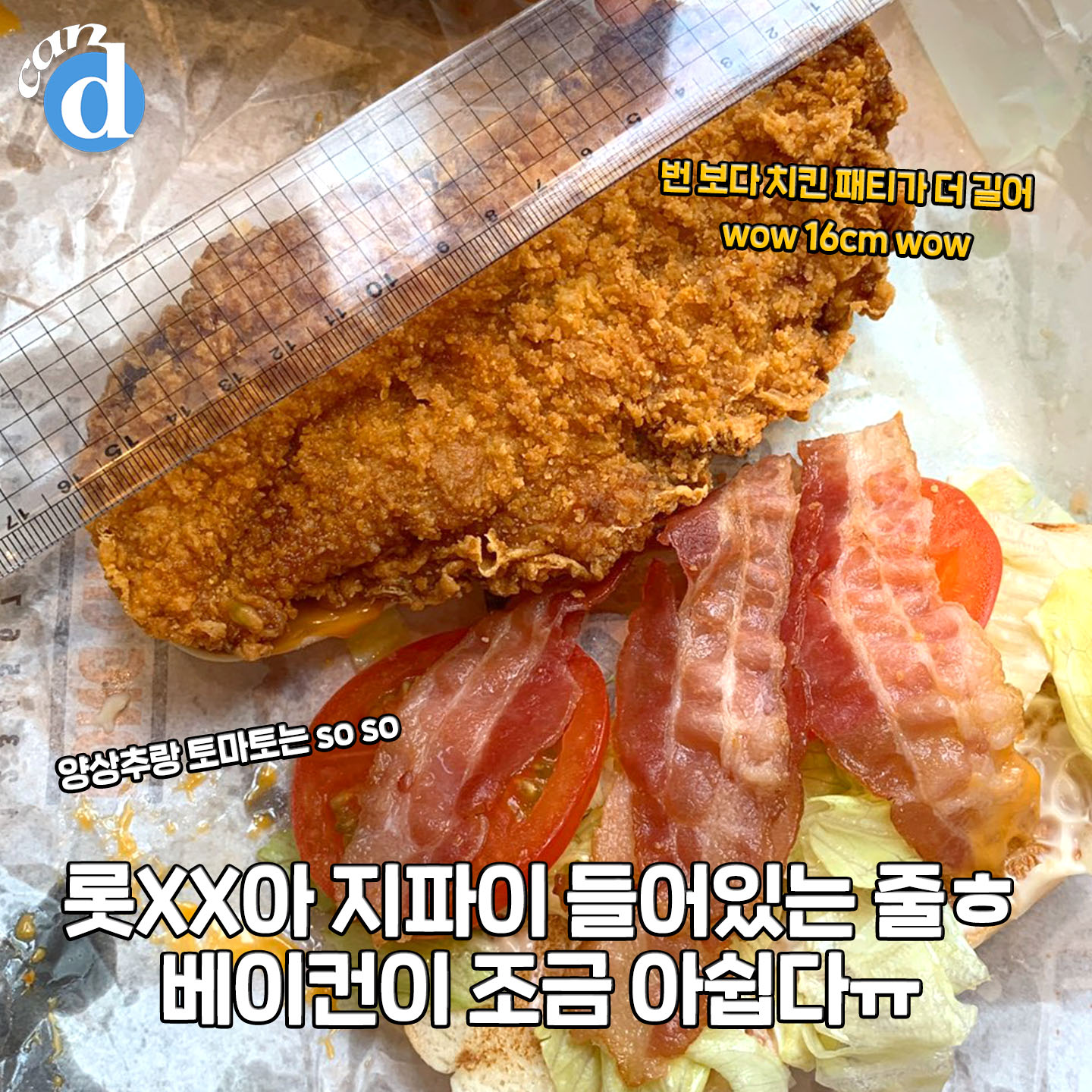 치킨버거에 베이컨+토마토 낀 먹자 수제버거를 뚝딱 먹은 것 같은 느낌.