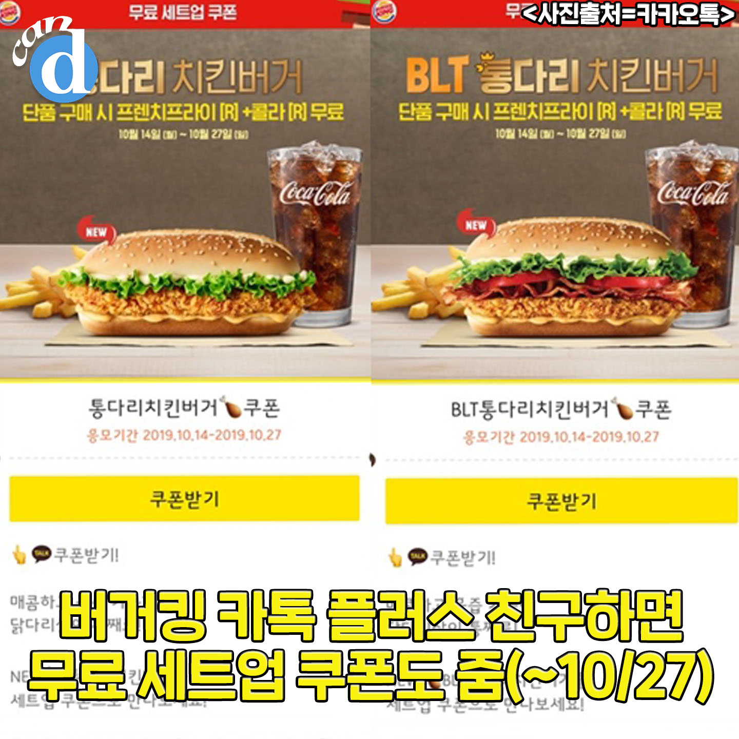 캔디는 카카오톡에서 버거킹을 친구 추가한 후 세트업 쿠폰을 다운 받았습니다. 무료 세트업 쿠폰을 직원에게 보여주면 오는 27일(일)까지 단품 가격에 프렌치프라이(R)와 콜라(R)까지 즐길 수 있다네요.
