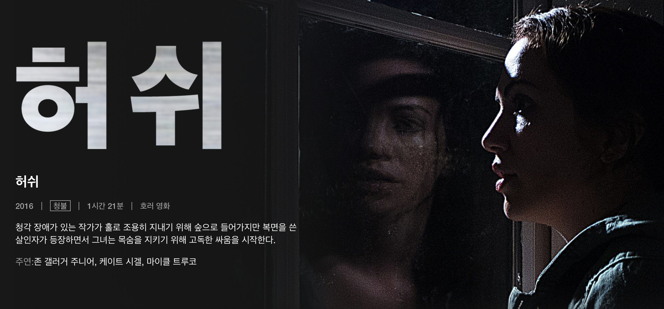 할로윈에 볼 호러 영화를 찾고 계신다면 주목해주세요. 긴장감 넘치는 상황에 손에 땀을 쥐게 하는 넷플릭스 공포영화 ’허쉬’(Hush)를 소개합니다.