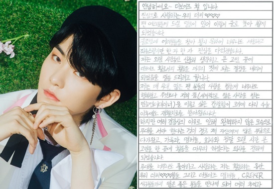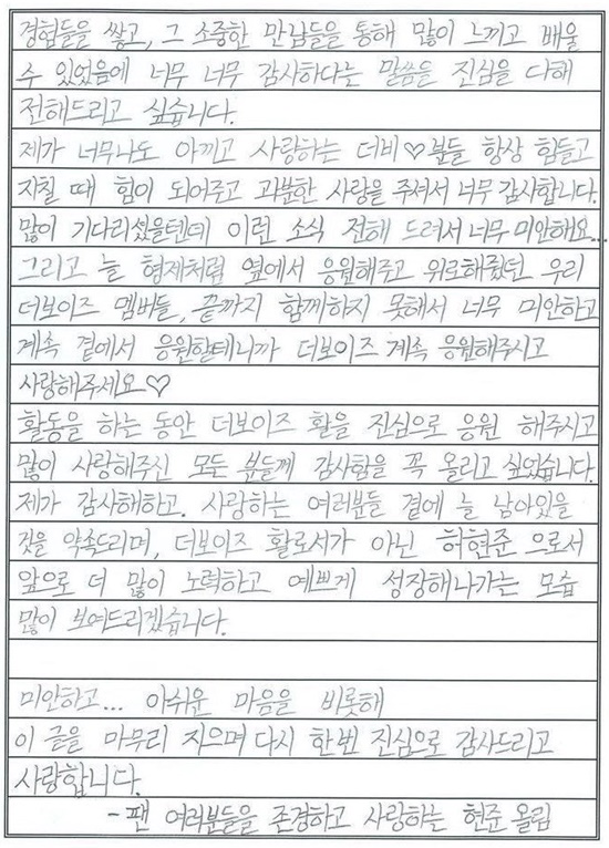 더보이즈 멤버들에게도 인사를 남겼다. "늘 형제처럼 옆에서 응원해주고 위로해줬던 멤버들, 끝까지 함께 하지 못해서 미안하다. 곁에서 계속 응원하겠다"고 적었다.