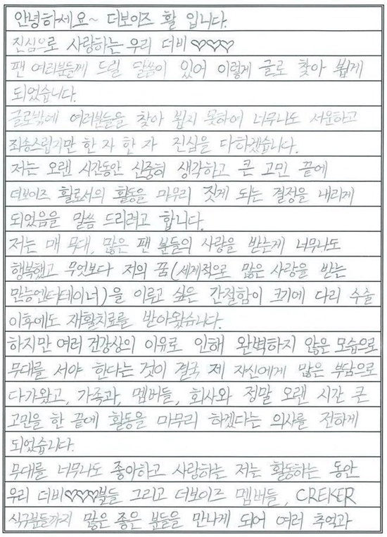 활은 23일 더보이즈 공식 팬카페에 자필 편지를 공개했다. "신중히 고민한 끝에 더보이즈 활로서 활동을 마무리 짓겠다는 결정을 내렸다"며 말문을 열었다.