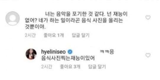 그러나 정작 혜린은 해당 악플에 "ㅋㅋ응. 음식 사진 찍는 재능이 있어"라는 답글을 달았고 그녀의 쿨한 반응에 누리꾼들은 뜨겁게 호응했습니다.