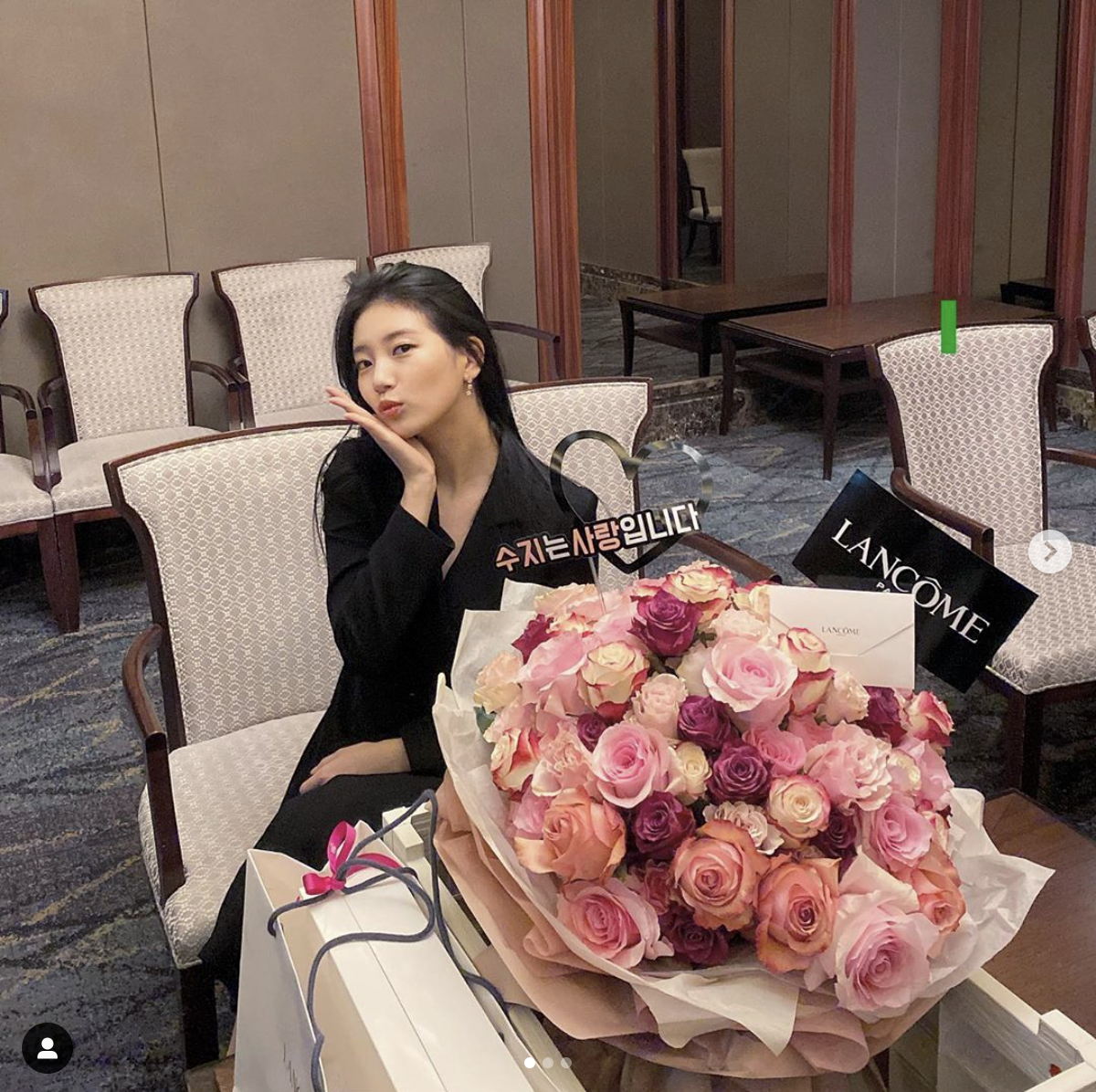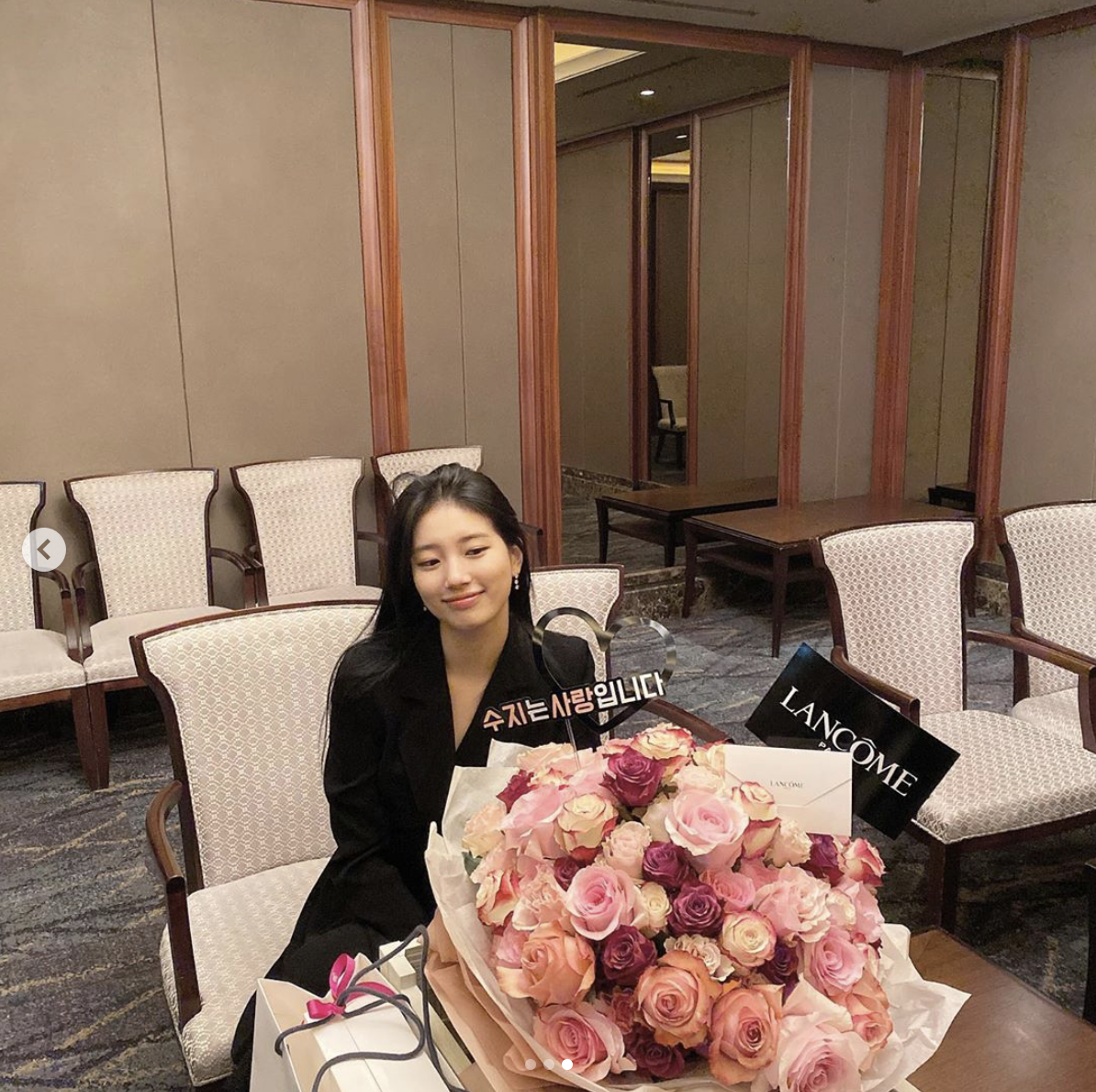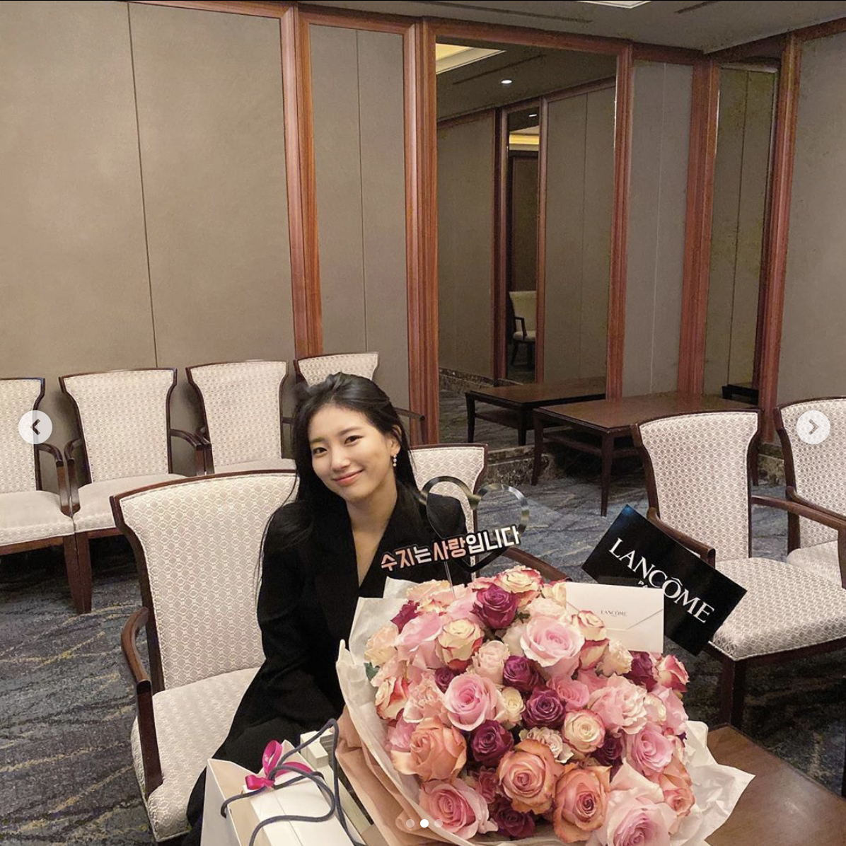 수지는 1일 자신의 인스타그램에 사진 3장을 공개했습니다. 꽃받침을 하고 애교있는 포즈를 취했는데요. 풍성한 꽃다발과 함께였습니다. 수지는 꽃보다 아름다운 미모를 자랑했죠.