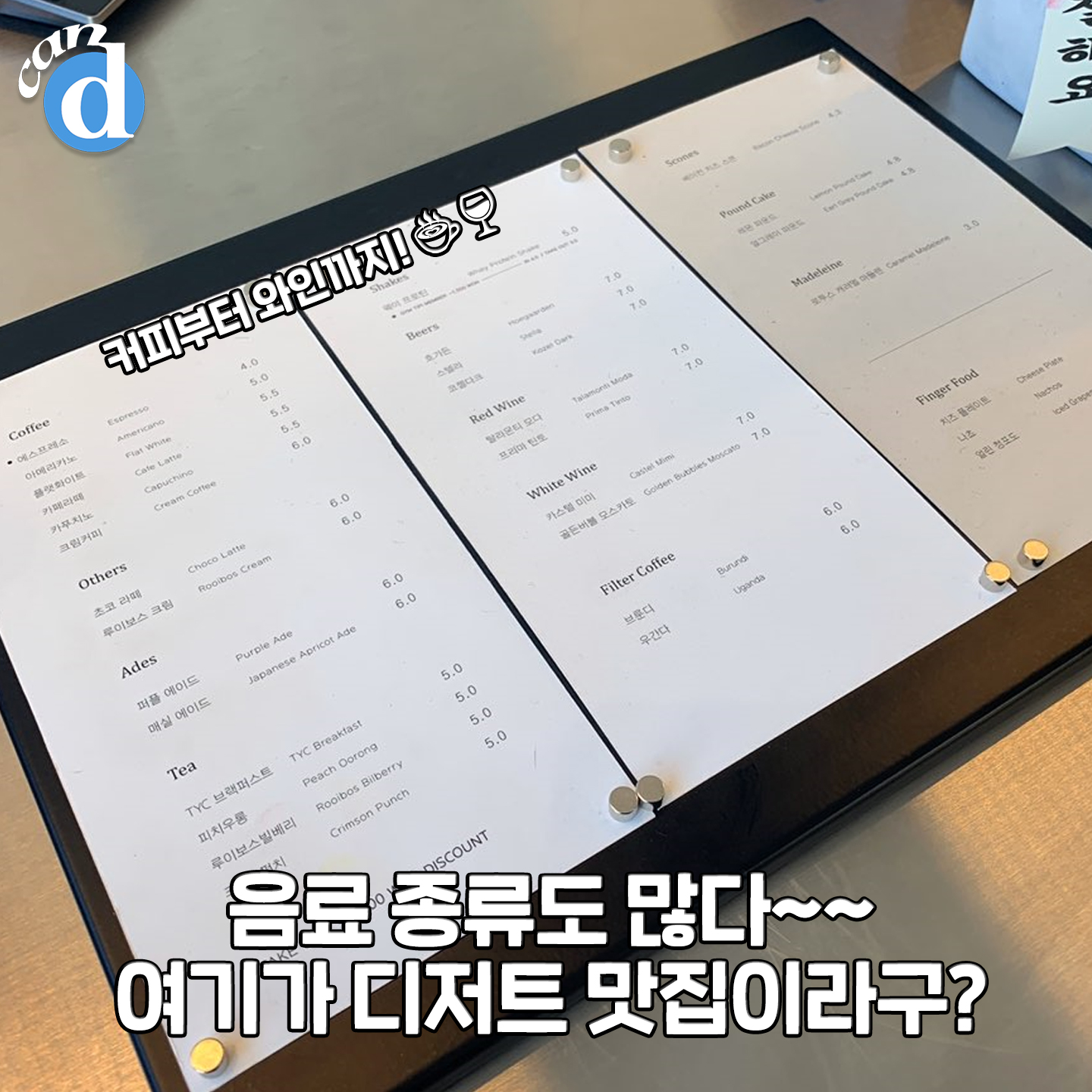 음료 종류도 많네요. 커피부터 에이드, 티, 와인, 맥주까지!