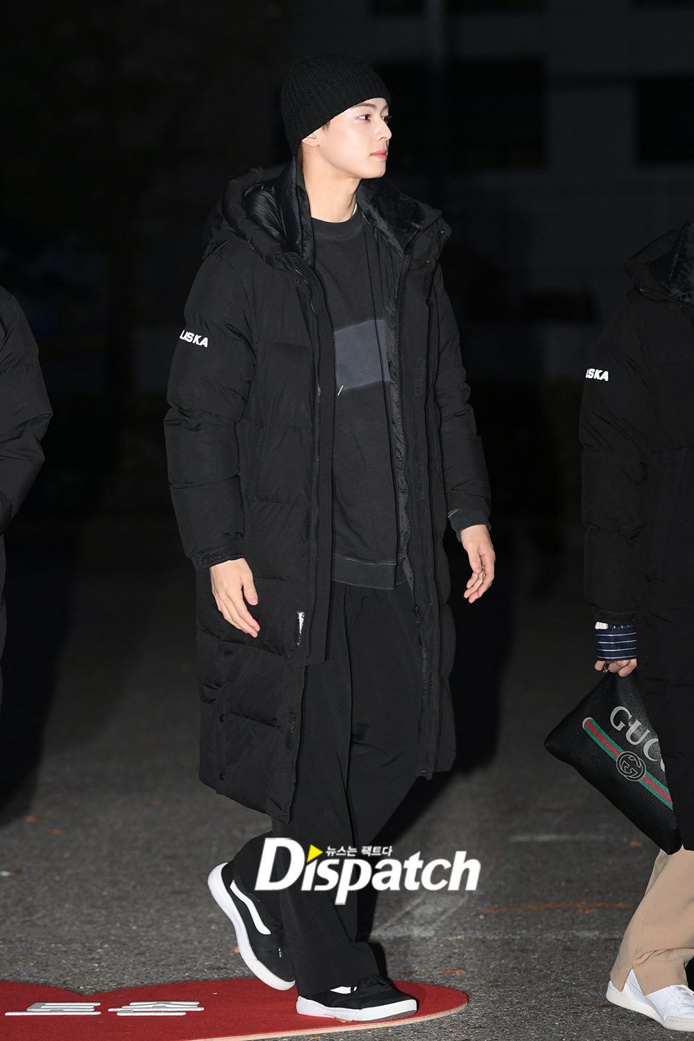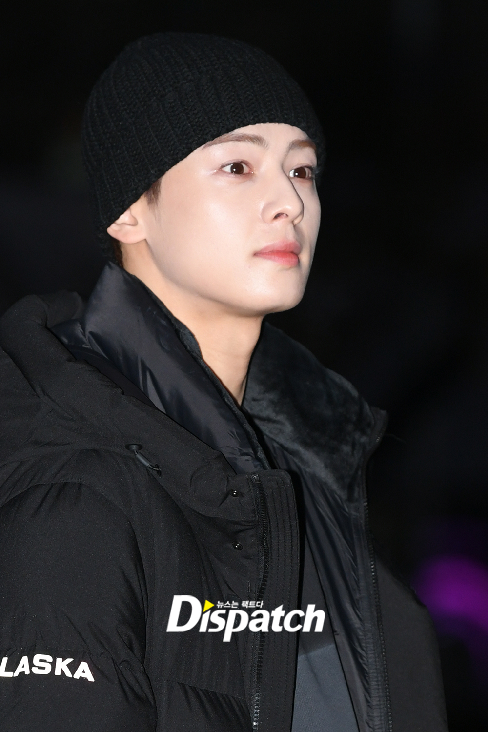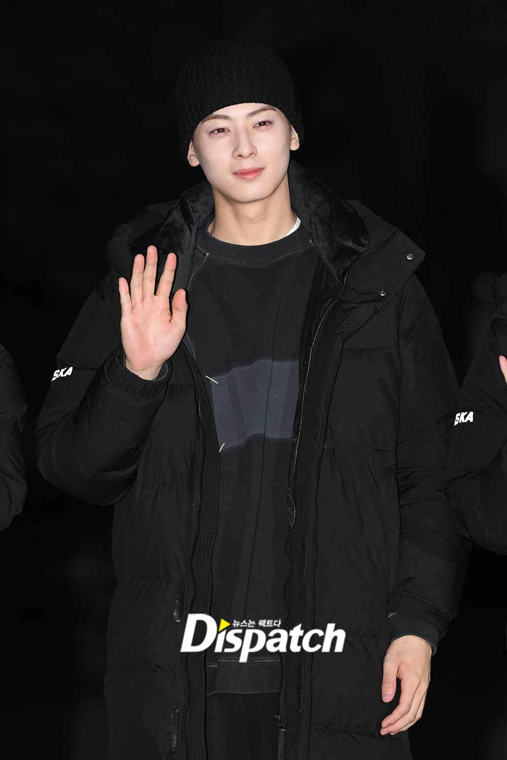 '아스트로' 차은우는 올블랙 패션으로 출근룩을 뽐냈다. 블랙 비니가 시선을 끌었다.