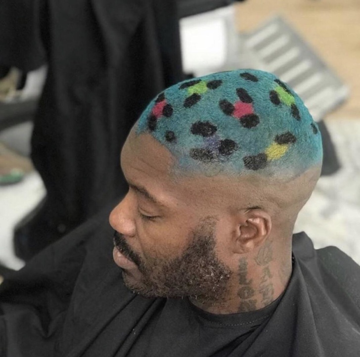 20. 초록 바탕에 형광색 점박이, 도대체가 의도를 알 수 없는 삭발 스타일
