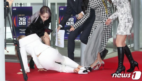 '마마무' 솔라가 포토월에 입장하다 심하게 넘어져 팬들을 걱정하게 했습니다.