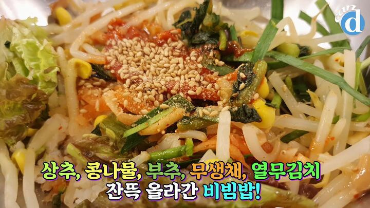 테이블 바로 앞에 있는 큰 그릇에서 무채와 콩나물, 상추를 손 가는 대로 집어 밥그릇에 수북하게 넣어주셨는데요.