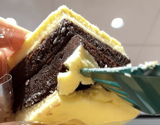 초코퍼지 브라우니 위에 노르스름한 크림치즈가 더해졌습니다.