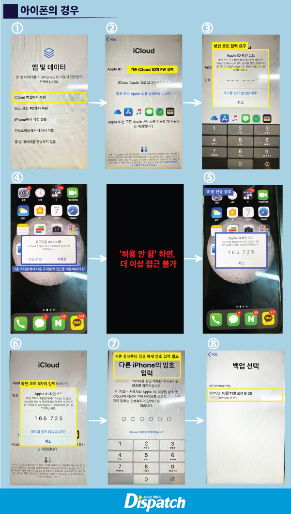 박혜진 기자는 아이 클라우드 백업 자료를 공기계(아이폰)로 옮겼다. 결과는, 복제 불가. 적어도 3단계 이상의 인증 절차를 거쳐야 했다. 쌍방향 확인 코드를 입력해야 하고, 잠금 비밀번호 6자리도 눌러야 했다.