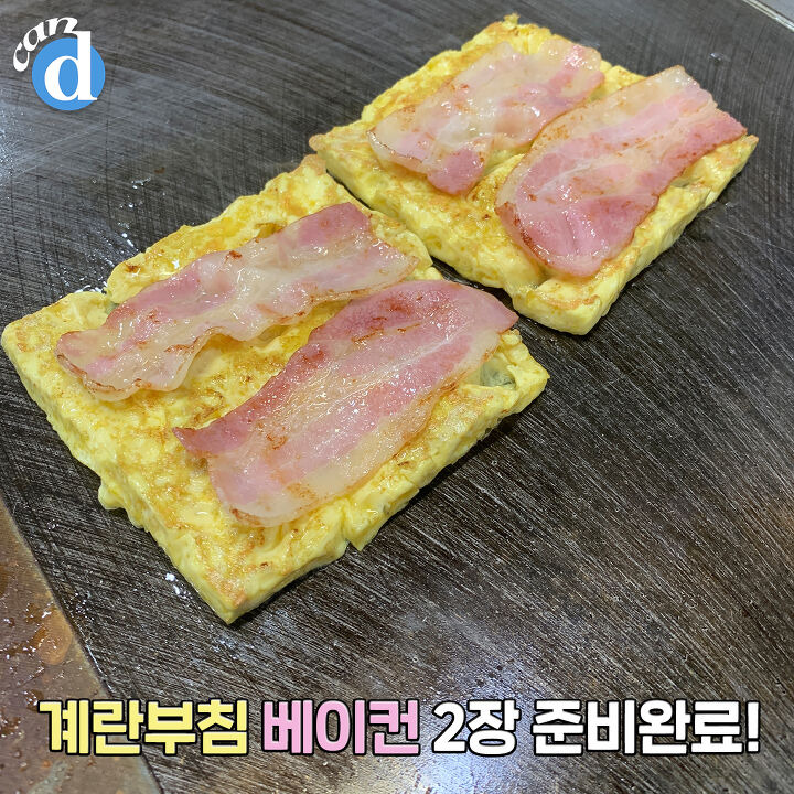 준비된 계란부침과 베이컨을 차례로 쌓아줍니다.