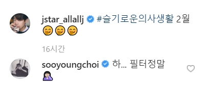 해당 게시물에 정경호의 여자친구 수영은 "하...필터 정말"이라는 댓글을 적었는데요.