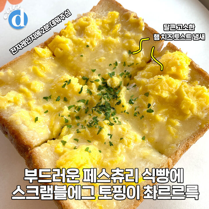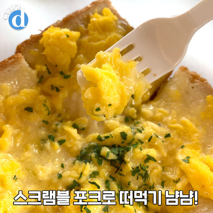 부드러운 페스츄리 식빵에 스크램블에그 토핑이 얹어져 있습니다.