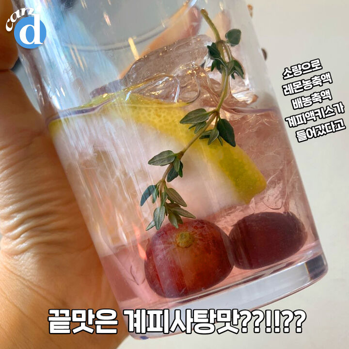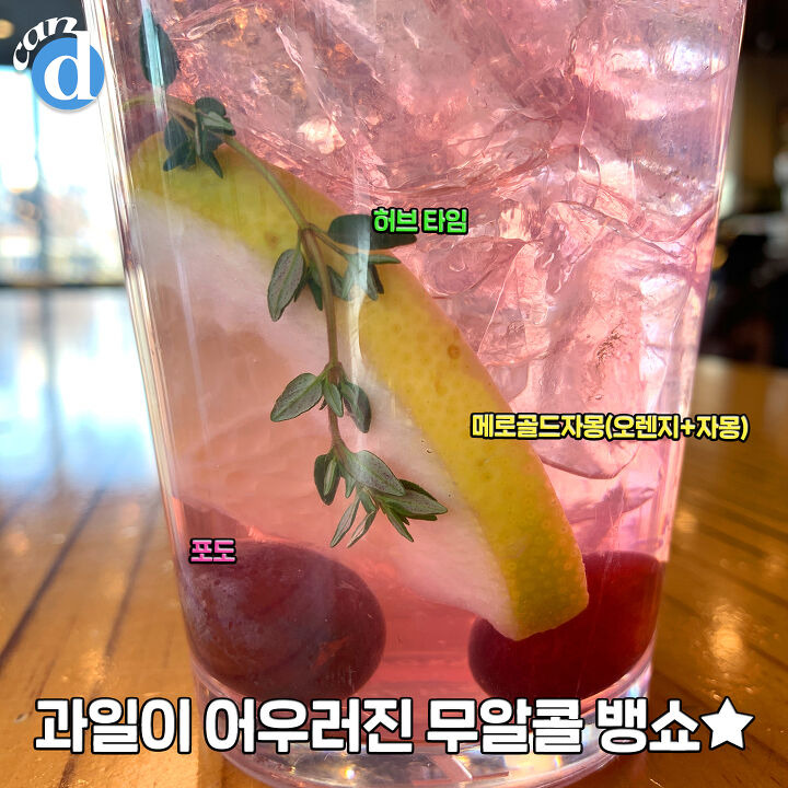 각얼음 아래로 메로골드자몽(오렌지+자몽) 포도, 허브의 한 종류인 타임이 들어가 있는데요.