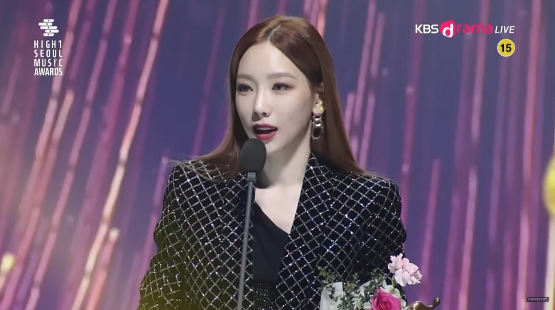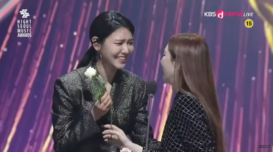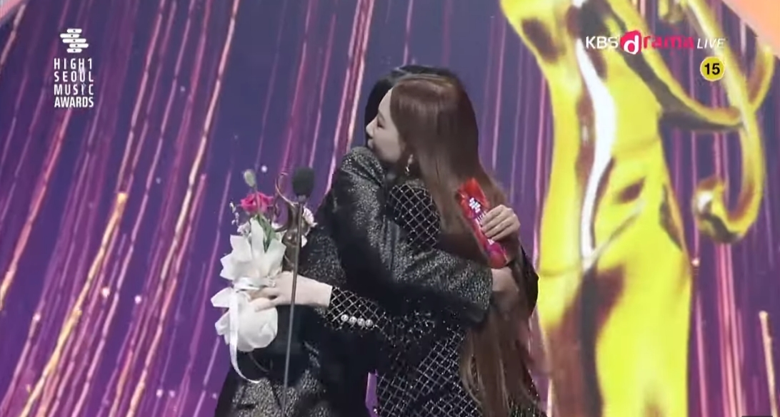 태연은 호명되자 무대로 올라갔습니다. 트로피와 꽃다발을 받았고요. 수영과 서로 따뜻하게 안았죠.