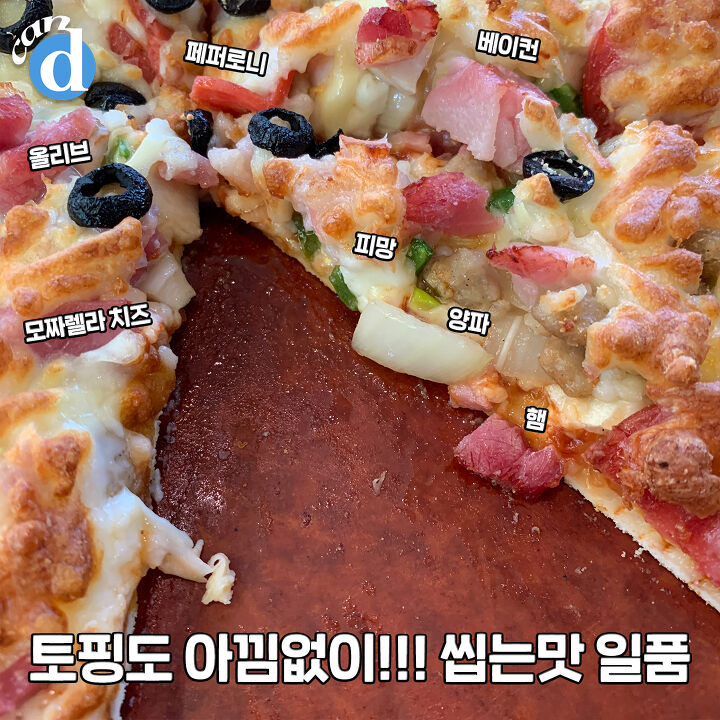 베이컨, 햄, 페퍼로니, 피망, 양파, 올리브, 모짜렐라치즈, 버섯 등.