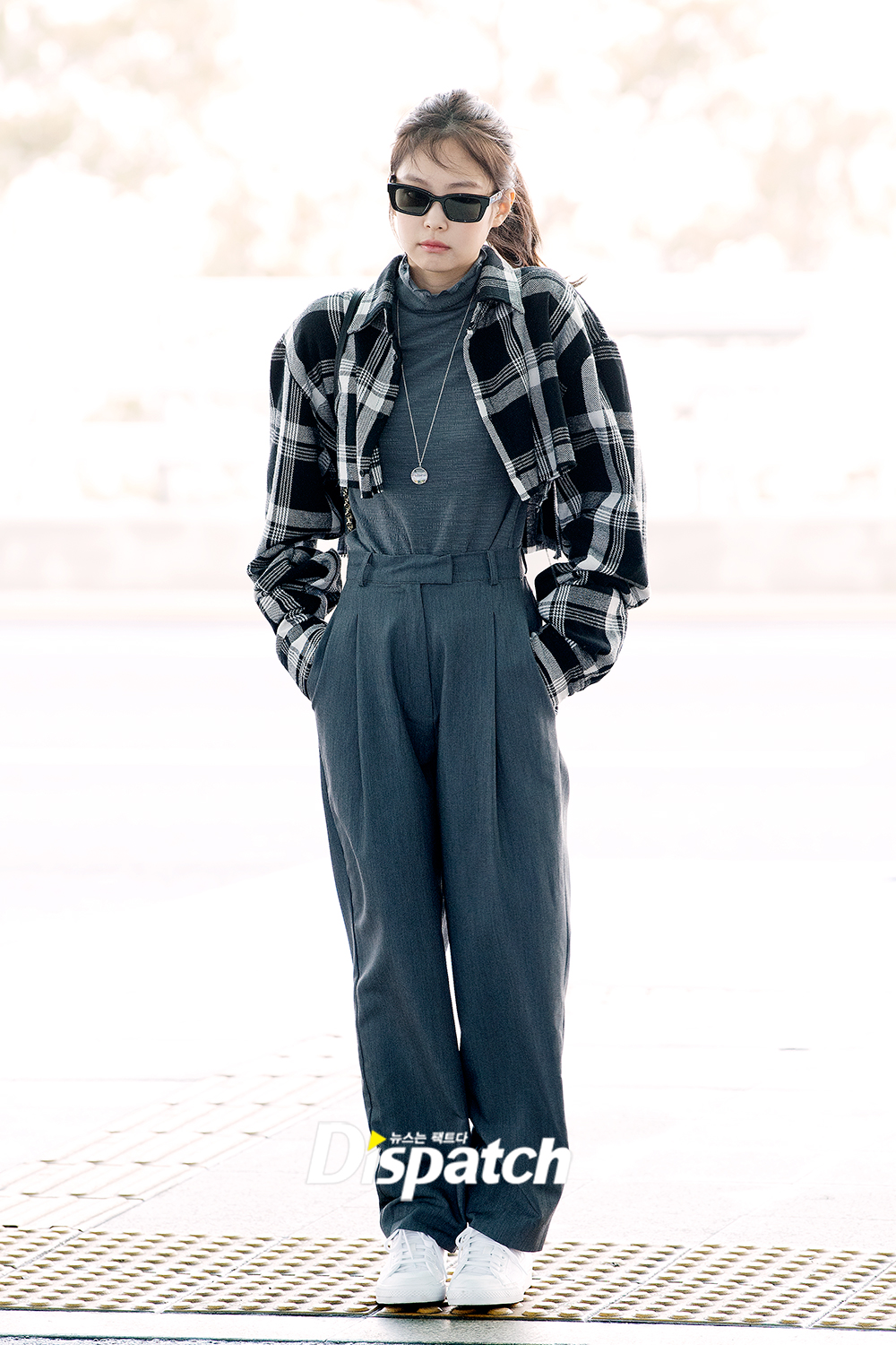 제니는 이날 시크한 공항패션으로 시선을 사로잡았다. 남다른 분위기는 물론 완벽한 패션센스가 돋보였다.