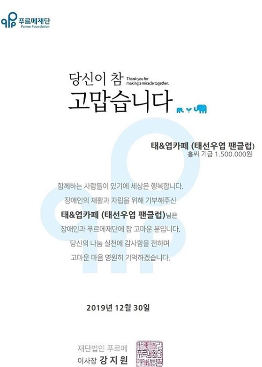 우엽과 태선은 지난 24일 개인 인스타그램을 통해 재단법인 '푸르메'로부터 받은 기부 인증서를 공개했다. '태선 우엽 팬클럽'의 이름으로, 150만 원을 기부한 것.
